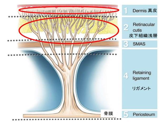 ジャルプロ スーパーハイドロが他製剤と異なる部分は、顔の皮膚を脂肪に固定している靭帯(=RetinacularCutis:レティキュアクティス)を狙って注入していくことです。レティキュアクティスは皮下組織浅層に存在します。